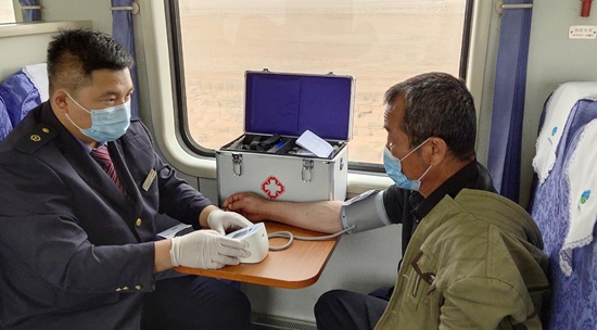 张利新在列车上为当地牧民测量血压。
