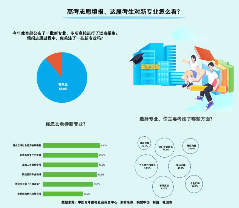高考成绩公布,志愿填报正在进行中。大学所学专业与未来从事的职业息息相关,甚至影响考生的一生,对很多考生和家庭来说,专业选择是志愿填报的重头戏。今年,教育部正式公布了新增的24种本科专业,多所高校进行了试点招生。考生对新专业有所关注吗?他们选择专业时看重哪些方面?