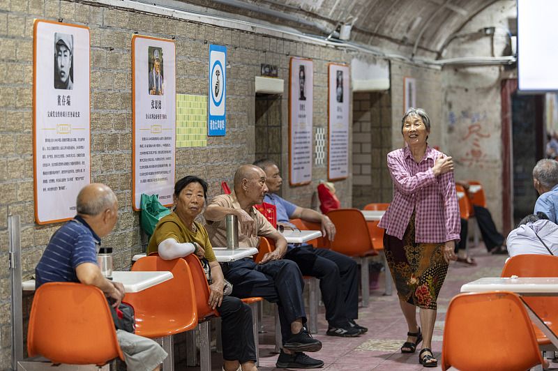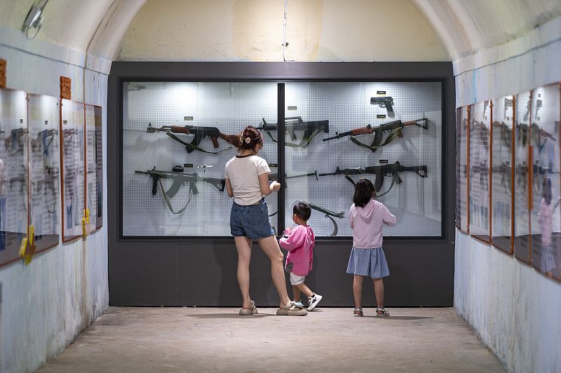 2024年7月8日,浙江省金华市婺城区人民东路防空洞工程里,市民正在清凉的洞内观看国防动员(人民防空)宣传教育主题展。