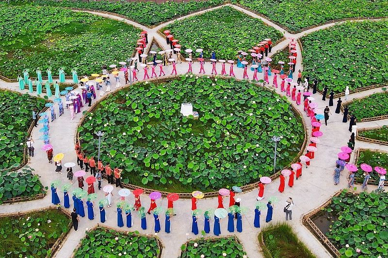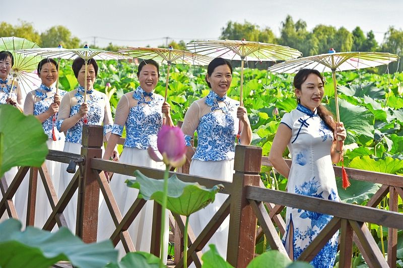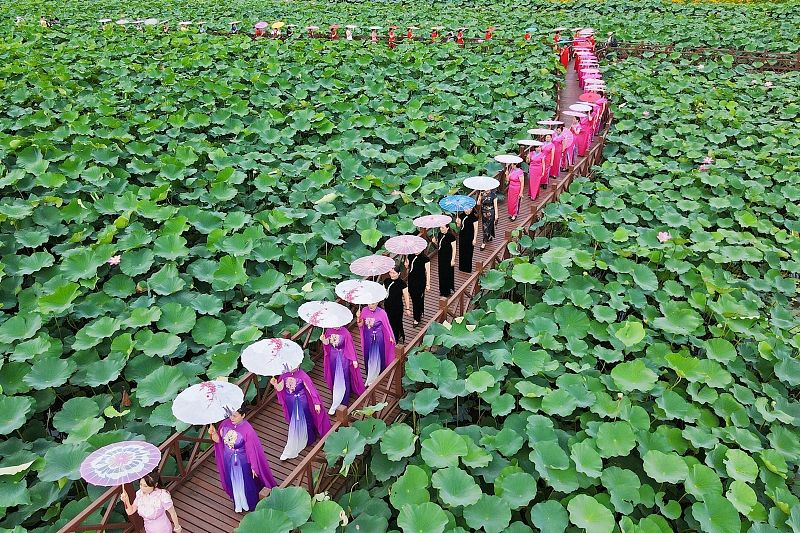 2024年7月8日,江苏南通,如皋市举办“2024年中国•如皋‘荷塘月色’百人旗袍秀”活动,来自当地和周边市(县)的6支旗袍队的100多名旗袍爱好者身着各色旗袍聚集如皋市城北街道平园池村,在千亩荷塘花海中手持油纸伞款款而行,上演了一场让旗袍与荷花完美融合的视觉盛宴,让前来观看的众多市民和游人欣赏到一幅别样的夏日美丽乡村田园风景。