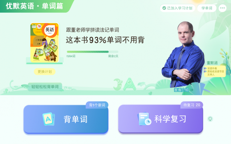 对成绩优异的孩子来说,掌握好的学习方法、专项培优才是致胜法宝。优学派AI学生平板为孩子提供了强大的专项提升功能,提供了超实用的学习好方法和技巧,帮孩子扬长补短,拓展培优。例如,孩子能跟着明星双语外教董默涵老师打造的“优默英语背单词”学习单词记忆技巧,根据英语拼读规律巧记单词,从而达到见词能读、听音会写的效果,单词不再死记硬背,通过掌握好方法提升成绩、高效培优。