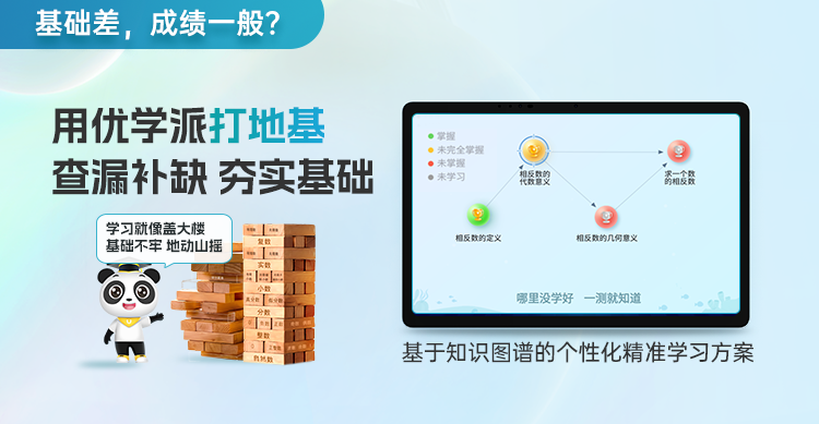 孩子考试成绩不理想,还是因为基础没打好。基础薄弱的孩子就直接用优学派AI学生平板的打地基功能,它提供基于知识图谱的专属个性化精准学习方案,能够跨年级精准定位孩子薄弱知识点,达到查漏补缺的效果,让孩子只学未掌握的课,只做不会做的题,可以高效科学地打好地基,孩子也能稳拿基础分。
