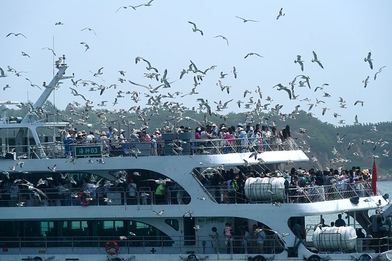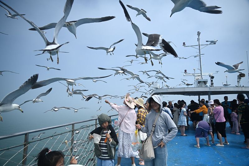 2024年7月10日,山东威海,在荣成市海驴岛景区,游客乘游艇观海鸥、赏海景,挑战水上飞人,乐享海上盛夏清凉。