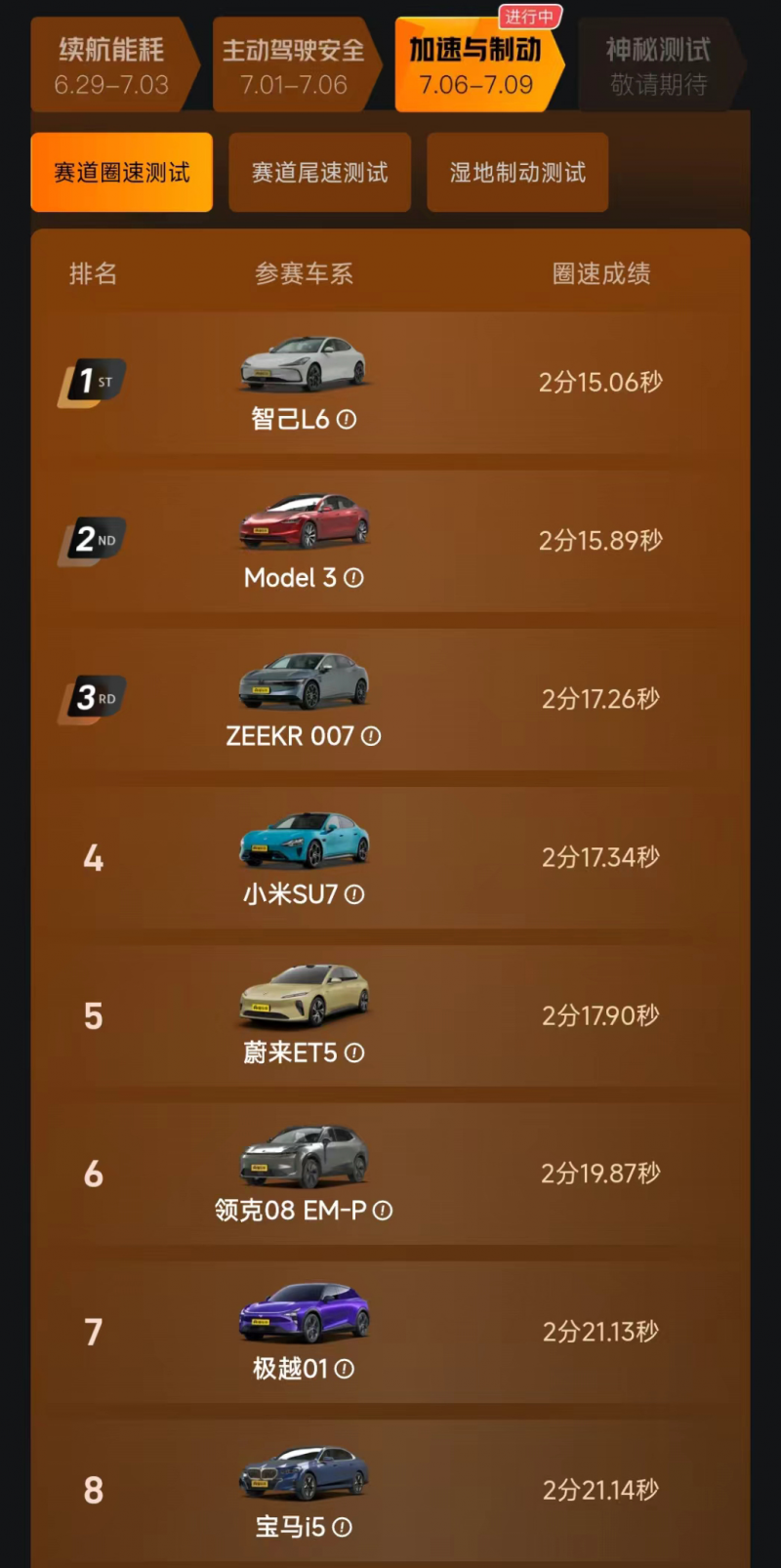 总体而言,在赛道圈速测试中,车身相对更大、重心更高SUV与轿车相比不占优势。SUV榜位列领先的领克08 EM-P,在总榜中位列第6位。排名前5的均为轿车,分别是智己L6、Model 3、ZEEKR 007、小米SU7和蔚来ET5。其中总榜领先的智己L6测试成绩为2分15.06秒,领先领克08 EM-P 4.81秒。均显示出中国品牌车型的不俗实力。