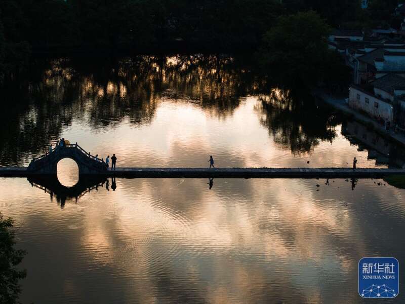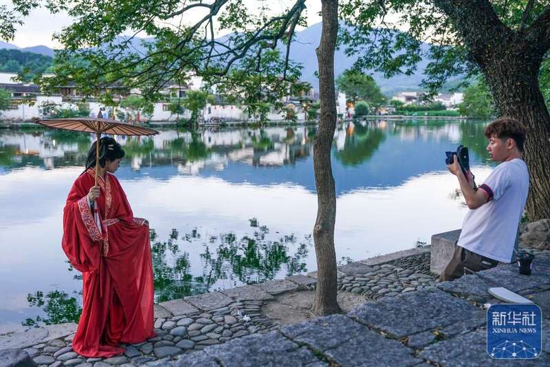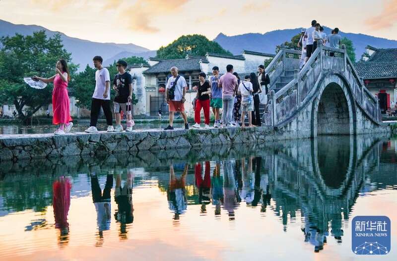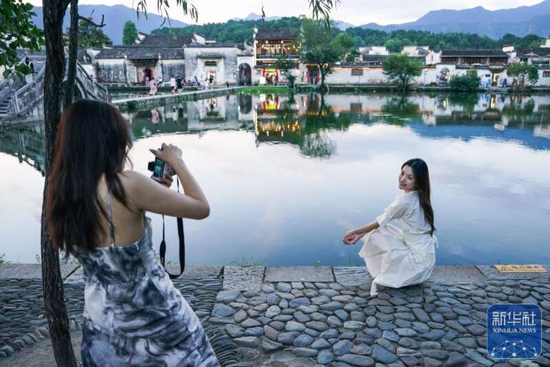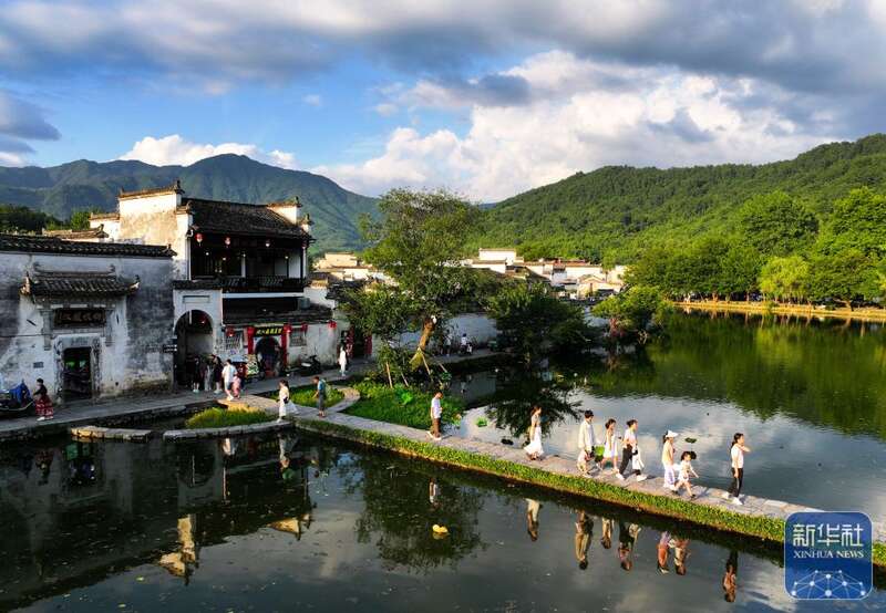7月7日,游客在安徽省黄山市黟县宏村游玩。新华社记者 杜宇 摄