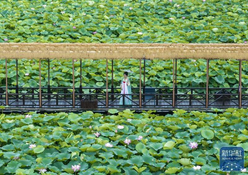 7月3日,游客在浙江省余姚市梁弄镇汪巷村的荷塘游览。新华社记者 翁忻旸 摄