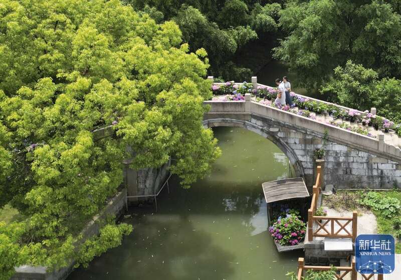 在上海东厍村,人们走过绣球花装点的始建于明代的瑞龙桥(6月4日摄,无人机照片)。新华社记者 刘颖 摄