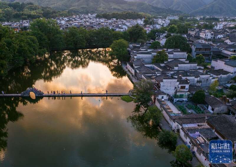 7月7日,游客在安徽省黄山市黟县宏村游玩(无人机照片)。新华社记者 杜宇 摄
