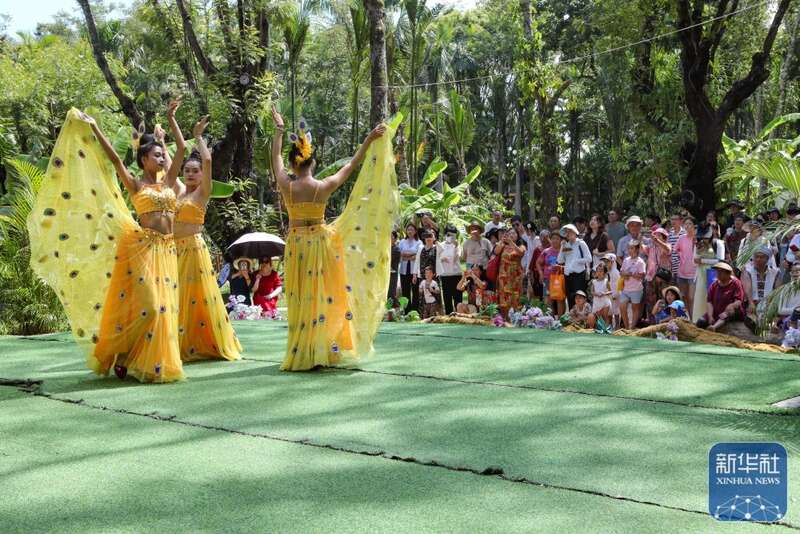 在云南省西双版纳傣族园景区内的传统傣寨曼听村,游客观看户外孔雀舞表演(7月7日摄)。新华社发(李云生 摄)