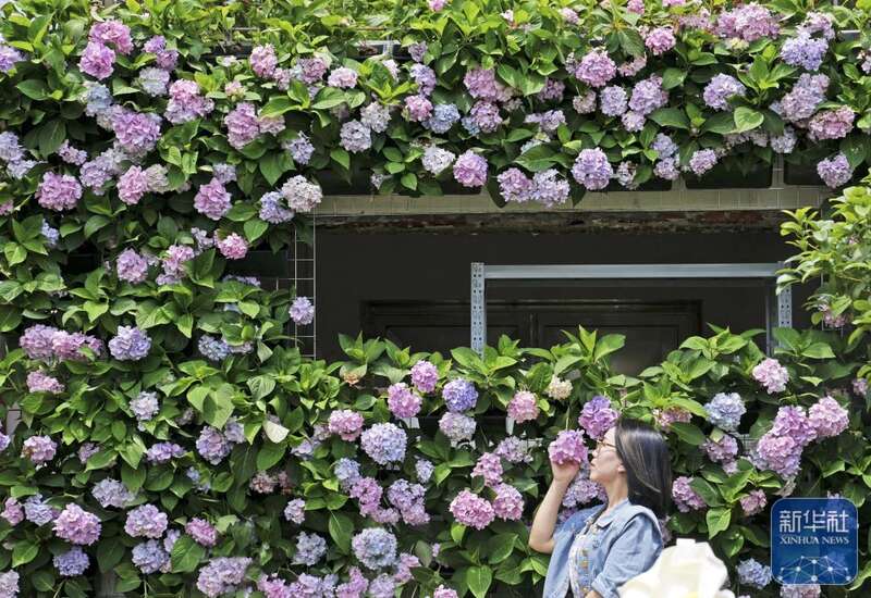 游人在上海东厍村的绣球花墙前拍照(6月4日摄)。新华社记者 刘颖 摄