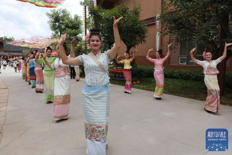 在云南省西双版纳傣族园景区内的传统傣寨曼听村,村民跳起迎宾舞(7月7日摄)。新华社发(李云生 摄)