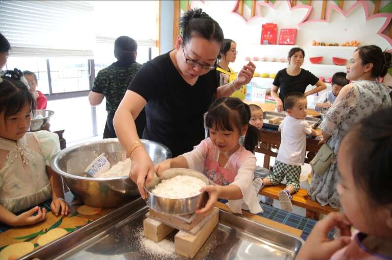 游客在非遗传承人带领下自己DIY蟠桃味传统糕点。上海市金山区供图
