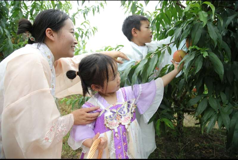 游客做好妆造采摘蟠桃。上海市金山区供图