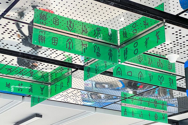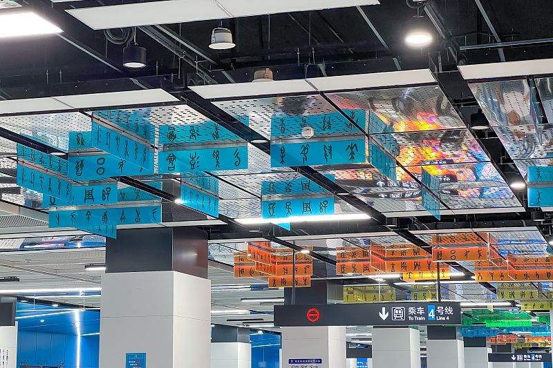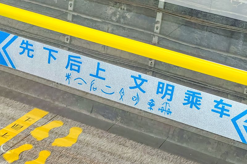 2024年7月11日,河南郑州,地铁4号线会展中心站内,站台屏蔽门的“先下后上文明乘车”的提示标语下方配有“甲骨文翻译”,站内天花板及多处展板也装饰有甲骨文,不少乘客直呼“太有历史底蕴”,一度走红网络。