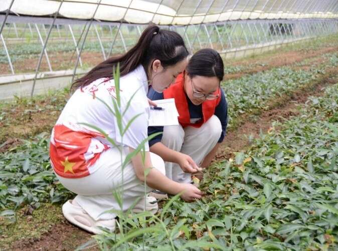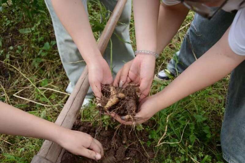 实践团成员深入黄精科技试验基地和黄精种植基地,仔细观察了解黄精种苗培育、生长、采挖过程。与村干部、农户和工人深入交流,就黄精种植、加工、销售产业链的各个环节以及未来的发展路径展开深入探讨。我校“黄精成‘黄金’”创新项目负责人也介绍了该项目是将黄精中提取的有效成分添加到美容护肤品当中,充分发挥黄精的抗氧化与抗衰老作用。这种多样化的黄精深加工产品开发思路,也为华溪村黄精的创新性发展提供了极具价值的参考,新时代新青年的智慧也为黄精产业注入了“新活力”。