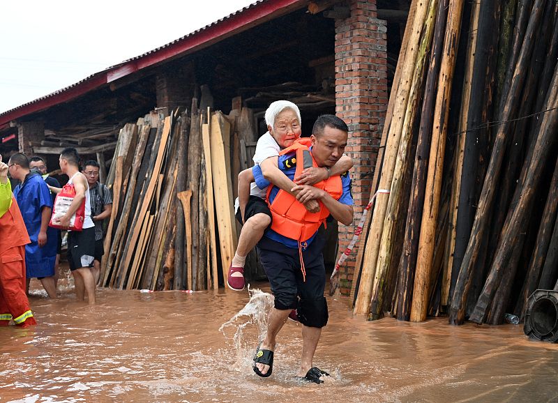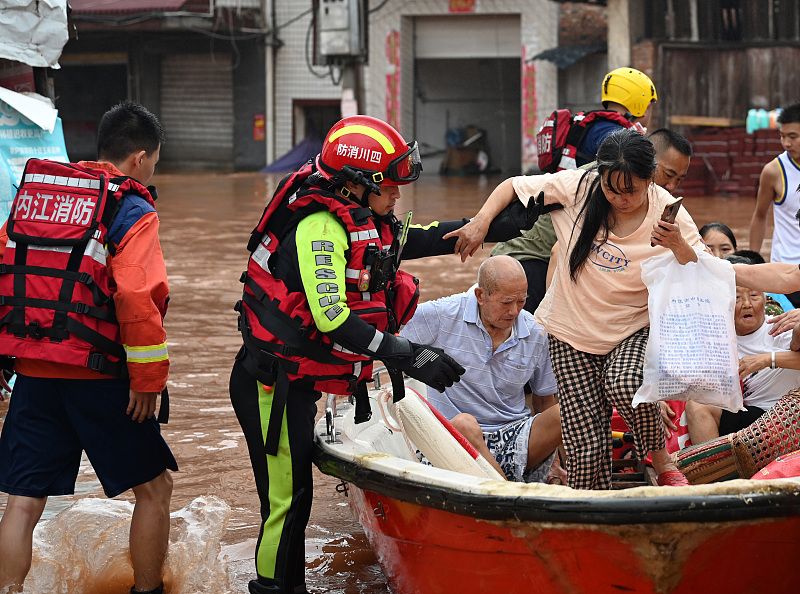 2024年7月14日,四川内江,东兴区田家镇,应急救援人员正在转移受困群众。