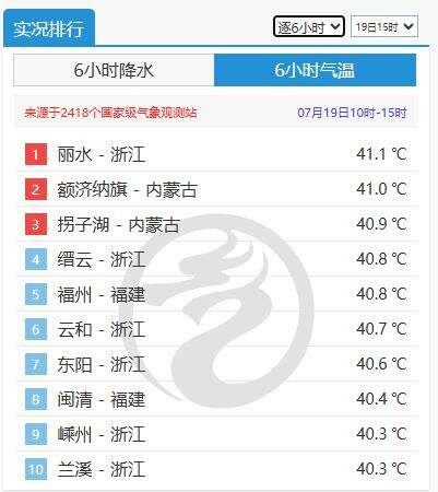 今天(7月19日),我国南方高温天气有所增强,上午9时,浙江部分地区已早早出现高温天气。截至15时,全国气温排行榜前十位40℃起步,浙江、福建多地最高气温都在40℃以上,其中福州达到40.8℃,创今年来气温新高;内蒙古高温也发展增强,额济纳旗达到41℃。