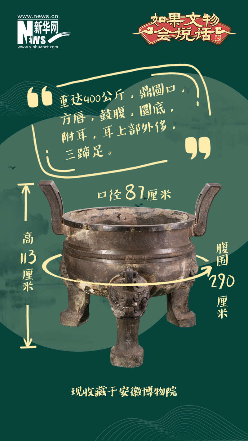 铸客大鼎高113厘米,口径87厘米,腹围290厘米,重达400公斤,鼎圆口,方唇,鼓腹,圜底,附耳,耳上部外侈,三蹄足。是中国首批禁止出国(境)展览文物。