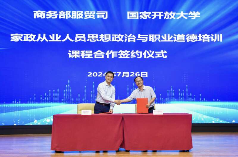 中国青年报客户端讯(中青报·中青网记者 杨洁)7月26日,国家开放大学举办“家政人员思想政治与职业道德培训课程合作暨职业道德与职业能力研修活动”。活动期间,国家开放大学与商务部服贸司签订家政从业人员思想政治、职业道德和职业素养课程使用协议。国家开放大学在上线840学时家政职业技能培训课程基础上,将再陆续上线230学时思政和职业道德、职业素养课程到全国家政服务信用信息平台,供全国家政从业人员免费在线学习。