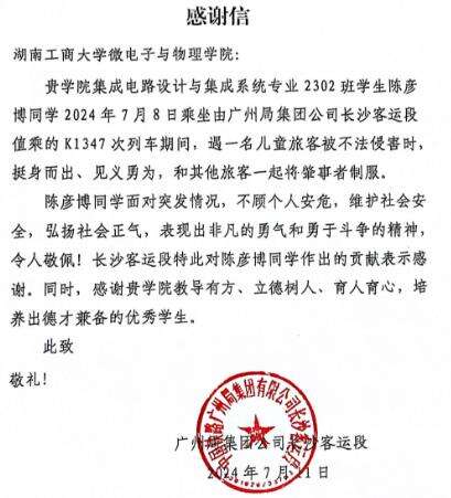 此外,7月11日,广铁集团长沙客运段也特地向陈彦博的学校发来感谢信,感谢其在K1347次列车上遇到一名儿童旅客被不法侵害时挺身而出、见义勇为,和其他旅客一起将肇事者制服。收到感谢信后,学校才知道陈彦博的见义勇为之举。7月27日下午,学校党委副书记易棉阳也率队前往陈彦博家中,给他颁发“见义勇为奖”证书,并发放慰问金20000元,奖励金5000元,对他的见义勇为行为进行表彰、鼓励。