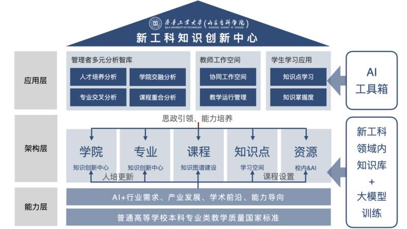 齐鲁工业大学(山东省科学院)新工科教育大模型以自主知识体系为依托,以“高算力、强应用”的人工智能为支撑,以新质生产力为引擎,在通用大模型基础上进行定制化开发,创新“人工智能+”教育新模式,形成结构化、可视化、系统化的特色知识生态,建设“教-学-管”一体化、一站式的自适应AI应用平台,打造教育资源汇集、共享、转化示范高地。同时,以智能化手段提升教学质量,满足差异化教学及个性化学习的需求,助力基础扎实、素质全面、富有创新精神和实践能力的创新应用型人才培养。