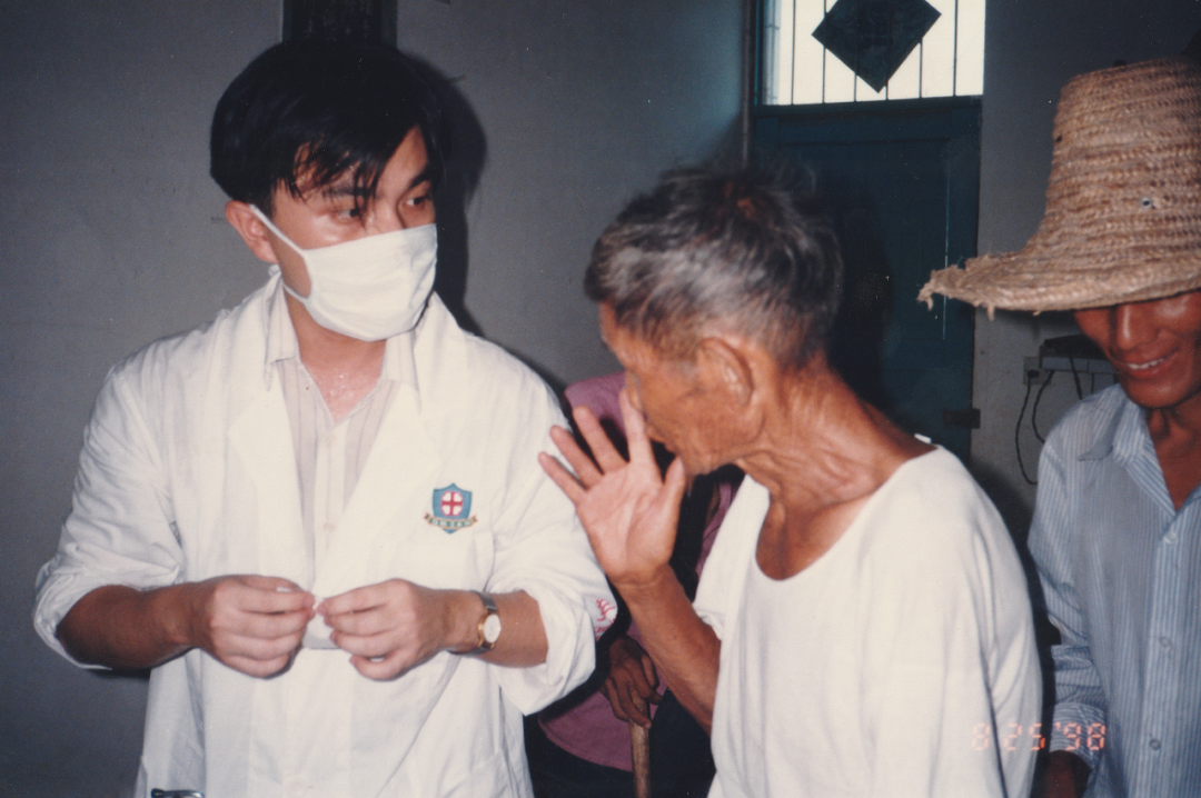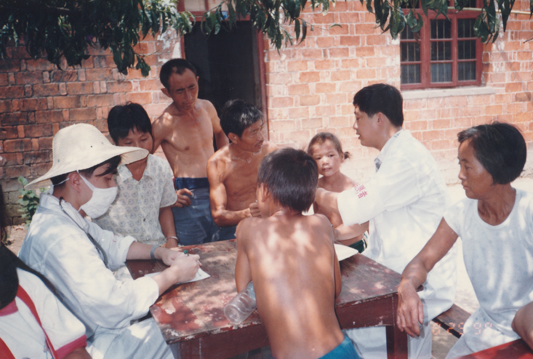 1998年8月,邓煜辉(后排左一)参加抗洪医疗队在江西九江为灾民义诊