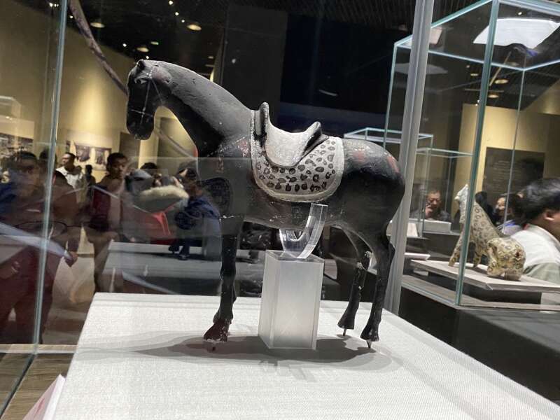新疆博物馆馆藏的两件彩绘泥塑舞马俑,生动地再现了唐代“盛装舞步”的精彩瞬间。这两件舞马俑均出土于阿斯塔那古墓群,其中,一匹马周身纯白,另一匹马棕红且带花斑。两匹马身形矫健,扬颈低头,双耳挺立,抬起蹄儿,仿佛伴随着音乐的律动翩翩起舞……