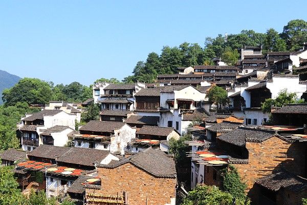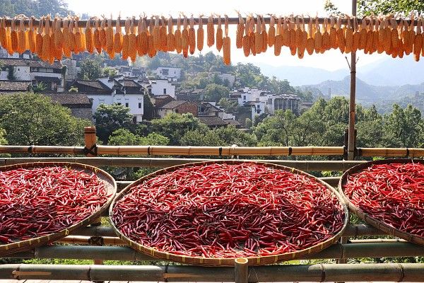 2024年8月7日,在江西省婺源县篁岭古村,当地村民用竹匾将红辣椒、玉米、南瓜、豆角等农作物,摆放在徽派民居的木架上进行晾晒,绘就出独特的“晒秋”农俗景观。篁岭古村“地无三尺平”,为顺应自然地形,家家户户在屋顶搭起晒架,屋顶成了晾晒农作物的主要场地。 中新社记者 熊锦阳 摄
