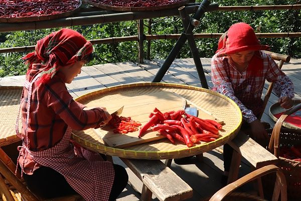 2024年8月7日,在江西省婺源县篁岭古村,当地村民用竹匾将红辣椒、玉米、南瓜、豆角等农作物,摆放在徽派民居的木架上进行晾晒,绘就出独特的“晒秋”农俗景观。篁岭古村“地无三尺平”,为顺应自然地形,家家户户在屋顶搭起晒架,屋顶成了晾晒农作物的主要场地。图为村民将辣椒切碎,方便晾晒。 中新社记者 熊锦阳 摄