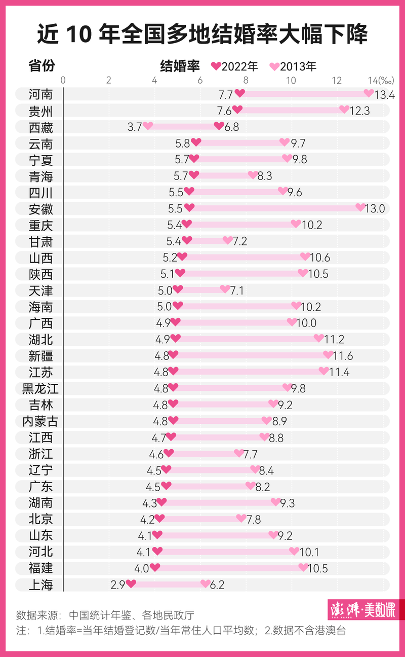 从 2013 年到 2022 年,全国多地结婚率大幅下降。安徽在近十年中结婚率降幅最大,仅有西藏的结婚率出现增长。