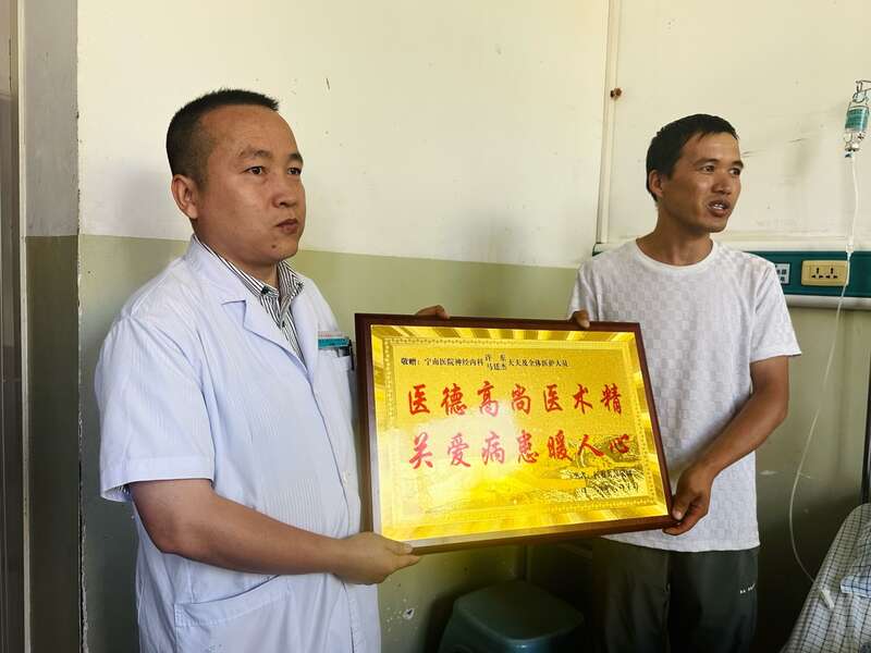 中国青年报客户端讯(中青报·中青网记者焦敏龙)8月10日上午,宁夏回族自治区中卫市海原县的宁夏回族自治区人民医院宁南医院(以下简称“宁南医院”)住院病房里,35岁的回族青年马忠明将一块印有“医德高尚医术精 关爱病患暖人心”字样的牌匾,赠送给了神经内科全体医护人员。
