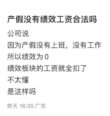 近日, 一位网友发帖求助称 自己因休产假没上班, 公司便将其绩效工资全扣了, 这样是否合理?