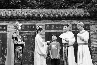“我觉得这种形式非常好,既有趣,还能让孩子学到知识。”游客徐女士笑着说。她特意带了上小学二年的儿子一起来游玩,孩子刚刚在一场“古人”问答中的表现令她甚是满意。原来,景区的NPC(非玩家角色)扮演成历史上与双龙洞结缘的文人墨客,邀请小朋友上前背诵李白、李清照等名人的诗词,答对者有奖励。随后,跟着NPC的脚步,游客在叶圣陶碑文纪念广场上,与NPC们手牵手围成一圈伴着音乐起舞,现场一片欢乐。