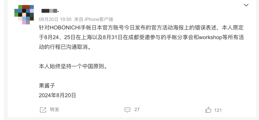 有博主发文表示,取消品牌邀请的所有活动行程,“始终坚持一个中国原则”。