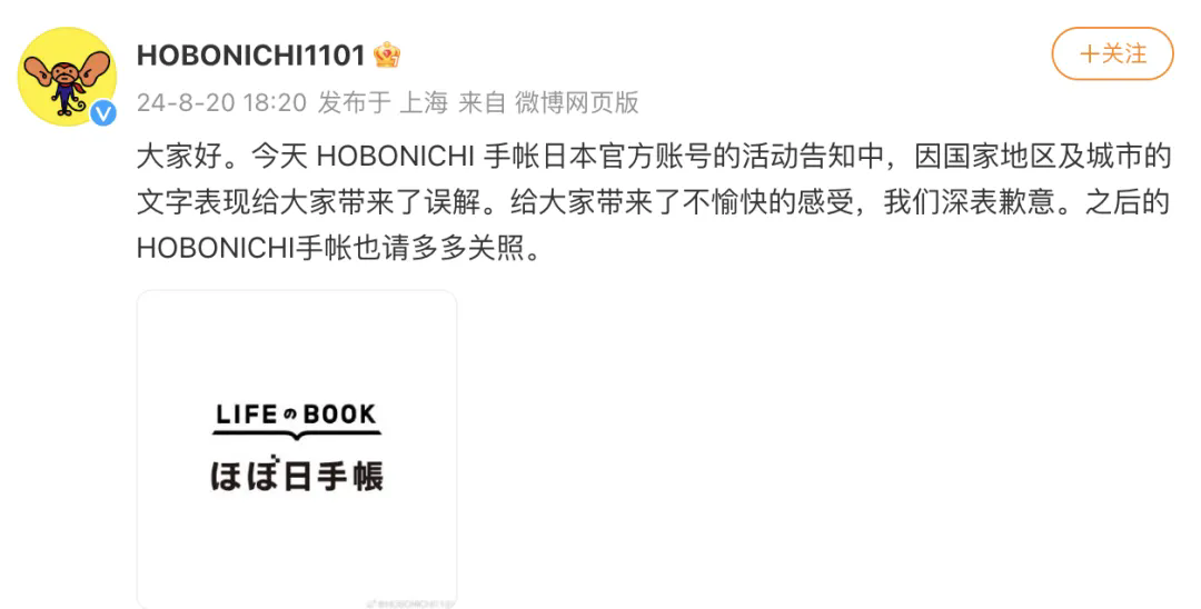 8月20日,有网友发现,日本一文具品牌“hobonichi”在海外社交平台发布的宣传海报中,将“中国”与“台湾”并列展示,而在中国社交平台上是另一版本的海报。