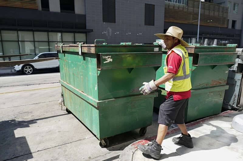 洛杉矶的一名垃圾车工人在高温下搬运垃圾箱。(资料图)