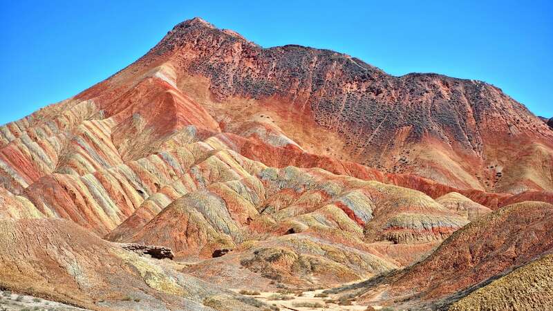 近日,在甘肃张掖七彩丹霞景区,远眺群山,只见红、黄、橙等多种鲜艳色彩交织在一起,仿佛打翻了大自然的调色盘。 (来源:CCTV纪录微博)