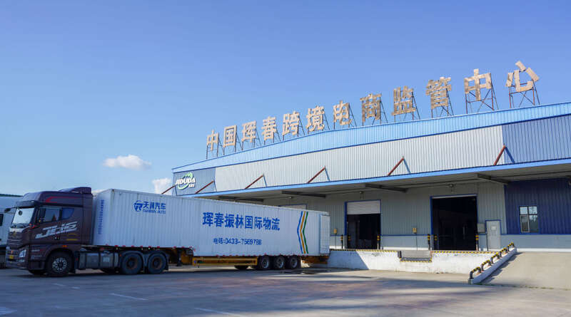 2024年8月13日,货车在吉林省延边朝鲜族自治州珲春综合保税区跨境电商物流仓库装载商品。珲春市位于中俄朝三国交界处,是吉林省唯一对俄口岸城市。近年来,珲春依托口岸,积极发展进出口加工、能源、跨境电商等产业集群。