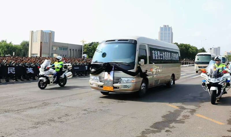 当地群众怀着沉痛的心情和诚挚的敬意,有的胸戴白花、手持菊花哭泣;有的举着印有“向英雄致敬”、“家乡人民接你回家”、“见义勇为写军魂 舍身忘死铸丰碑”等字样的横幅;有的长按汽车鸣笛致哀,悼念家乡英雄。