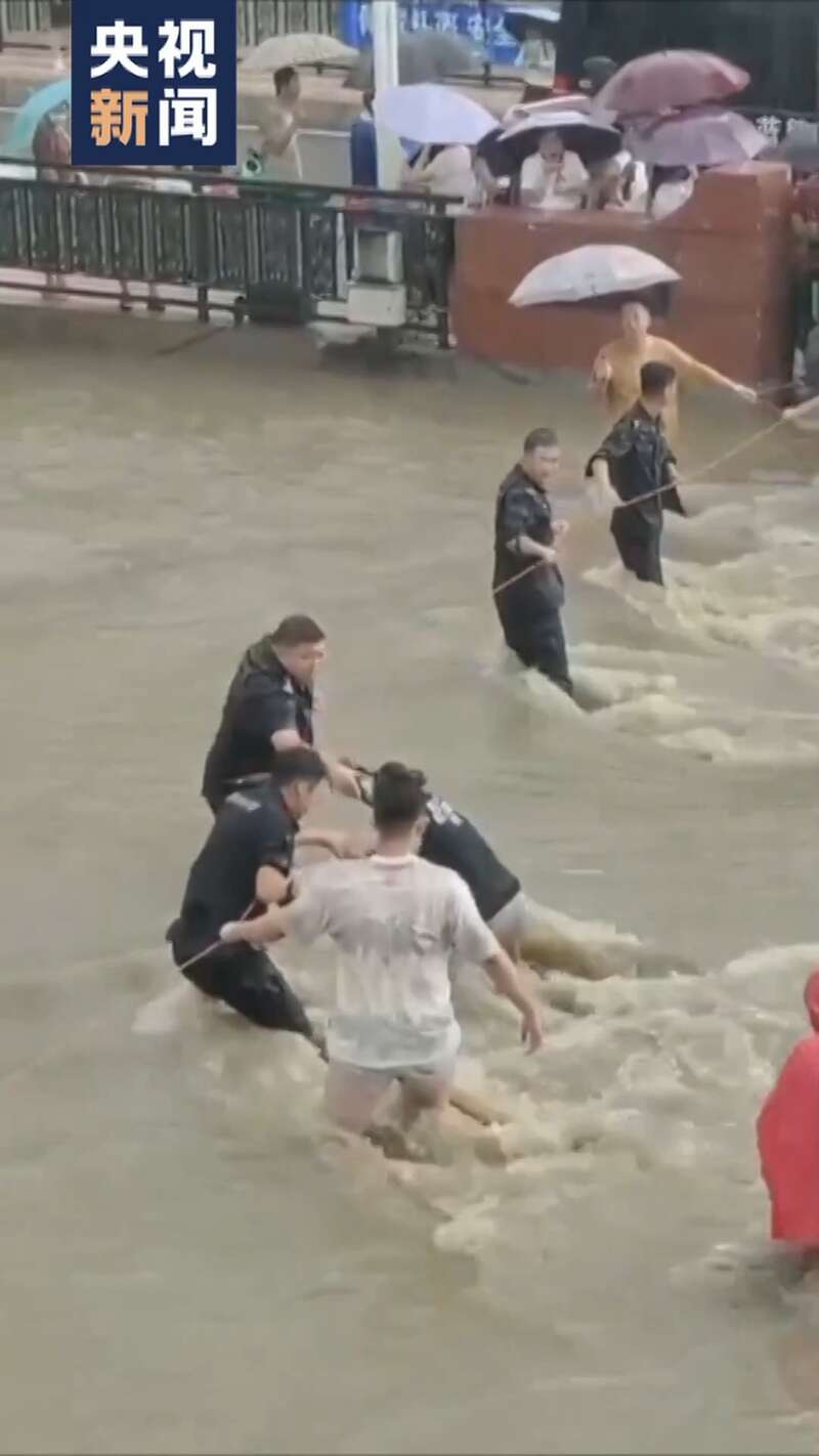 近日,辽宁大连普兰店区突降暴雨。在急流低洼路段,巡特警队员用身体和安全绳搭起“人形浮桥”,护送群众通过危险区域。