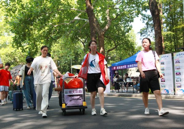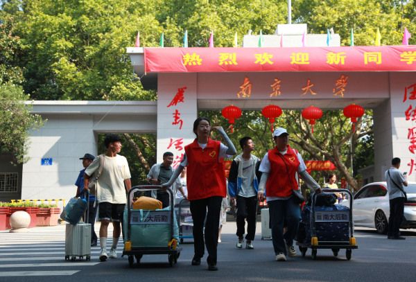 为保障新生顺利报到,南京大学开放校园,让送学家长车辆有序进入校园,高年级学生披上红马甲,志愿协助新生们搬运行李。