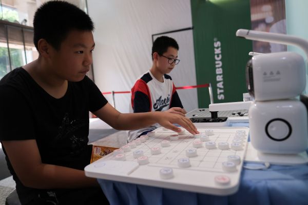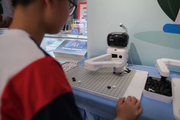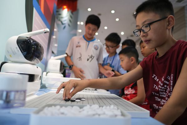 2024年8月26日,湖南长沙,在芙蓉中路湖南图书城,孩子们正在与下棋机器人对弈,助力自身棋艺提升的同时,享受与“高手”对弈的乐趣。