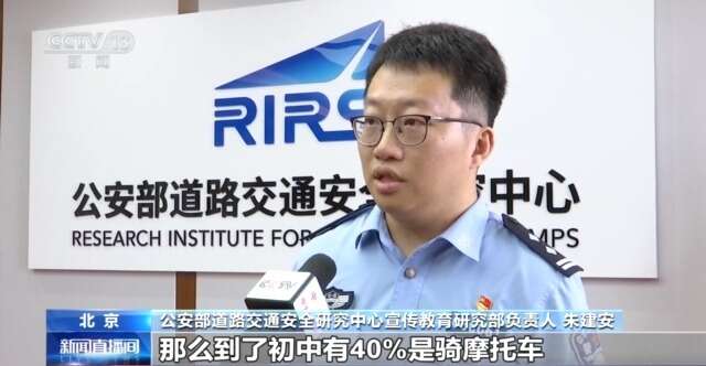 公安部道路交通安全研究中心宣传教育研究部负责人 朱建安:针对小学的中高年级,有50%的事故是在骑非机动车的时候发生的。到了初中,还有40%是骑摩托车,这个比例随着到高中上升到60%。其实这也表明,有一部分学生未到法定年龄就自己骑车上路,这是造成事故的一个很重要的原因。