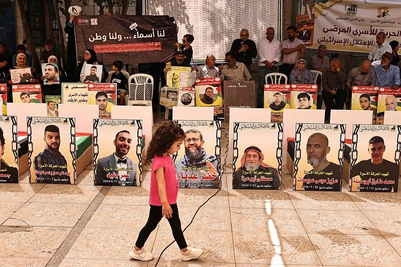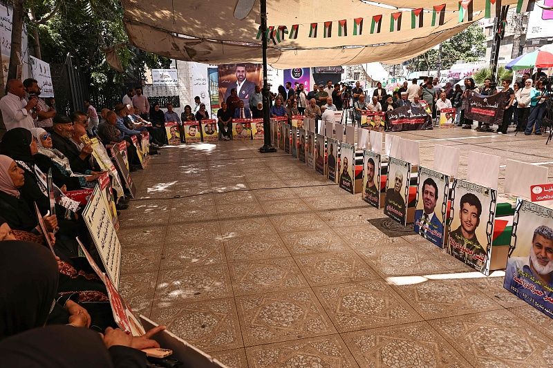 当地时间2024年8月27日,约旦河西岸拉姆安拉,巴勒斯坦人参加示威活动,要求释放被以色列监狱关押的巴勒斯坦囚犯的尸体。
