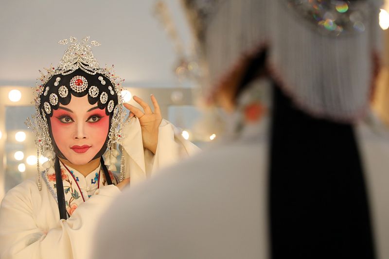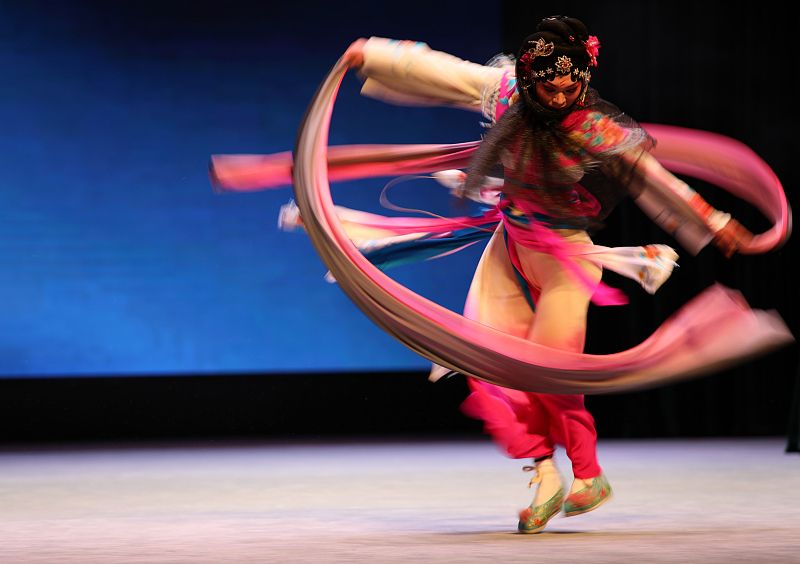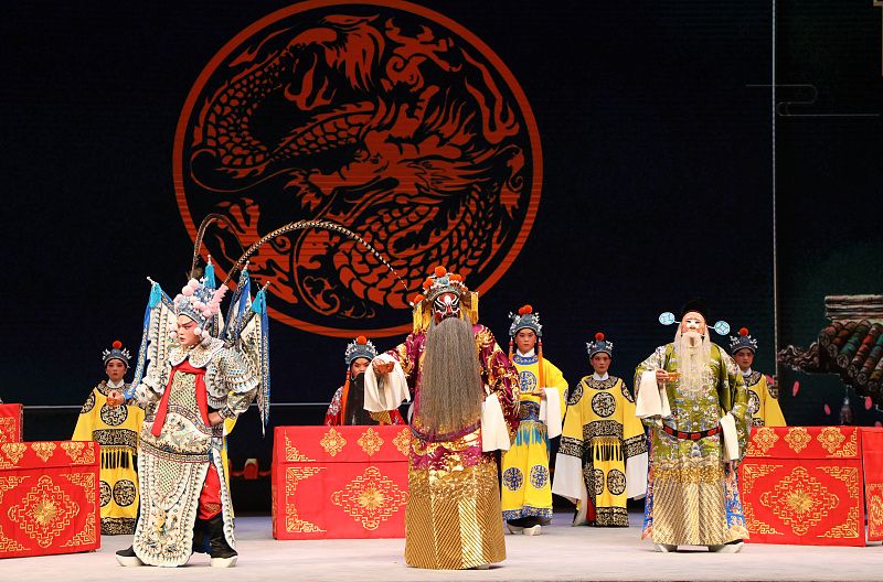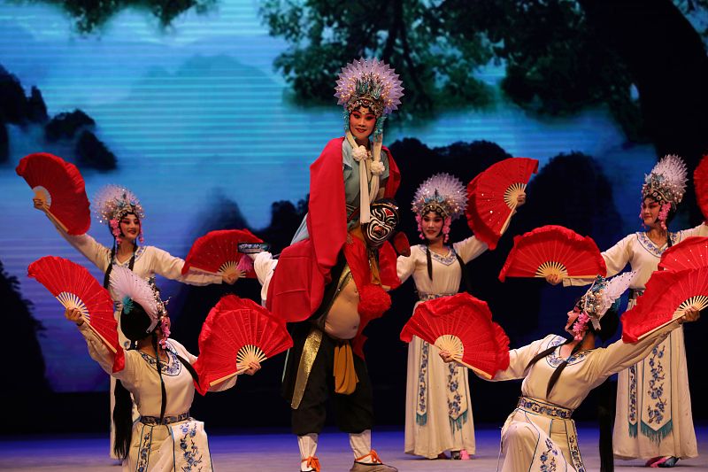 2024年8月27日,山东滨州,在2024首届中国戏曲稀有剧种优秀剧目展演的戏台上,来自湖北省老河口市湖北越调仙人花鼓戏艺术保护传承中心戏曲演员在表演湖北越调《伐子都》。
