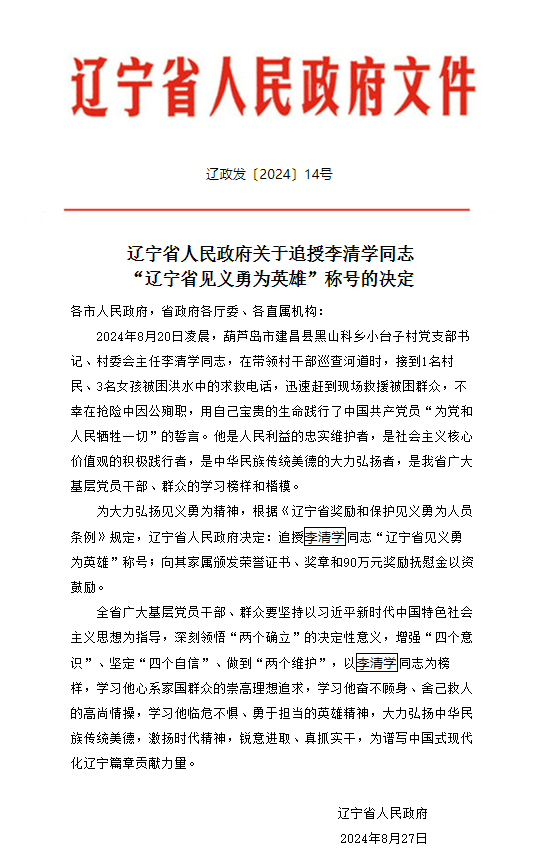 8月29日,辽宁省人民政府发布文件,决定追授李清学“辽宁省见义勇为英雄”称号。