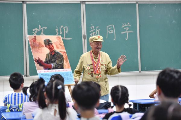 2024年8月28日,在合肥市长江路第二小学,今年90岁抗美援朝老兵宣钜华在向一年级新生讲述红色故事。