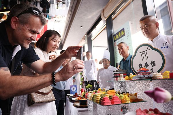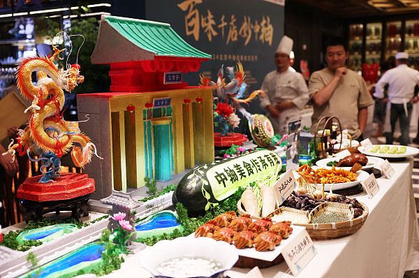2024年8月28日,北京,第三届“百味千店妙中轴——2024北京中轴线美食文化节”在淮扬府正式启动。全聚德中轴食礼、仿膳茶社、南来顺、都一处、护国寺小吃、茶汤李、萃华楼、马凯餐厅、北京稻香村、淮扬府等27家中轴线餐饮食品商户带来了上百种特色美食以及非遗技艺的展示。