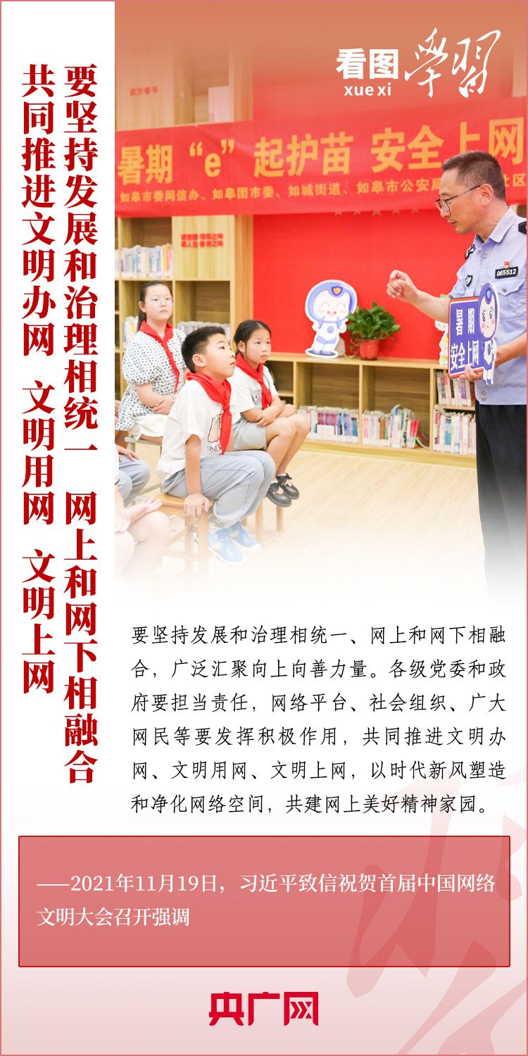 “坚持发展和治理相统一、网上和网下相融合,广泛汇聚向上向善力量”“共建网上美好精神家园”。习近平总书记格外重视网络空间这一亿万民众共同精神家园的建设,围绕网络文化和网络强国建设作出了一系列重要深刻论述。
