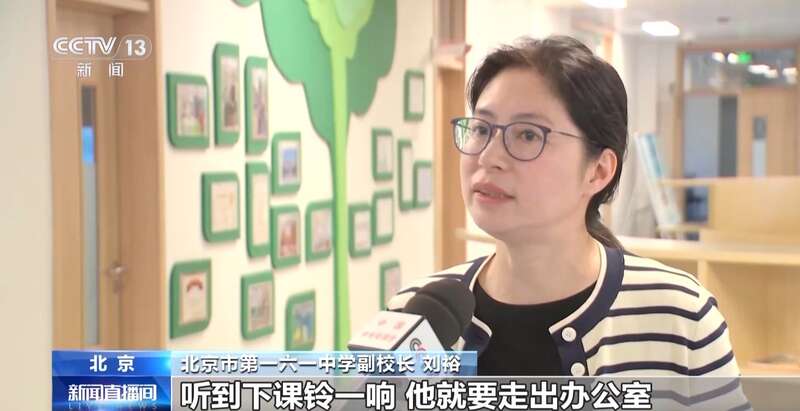 北京市第一六一中学副校长 刘裕:学生处的老师、校医和年级的值班老师,听到下课铃声就要走出办公室,让学生在需要帮助时随时能找到老师。